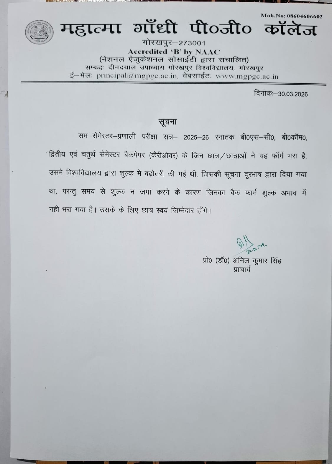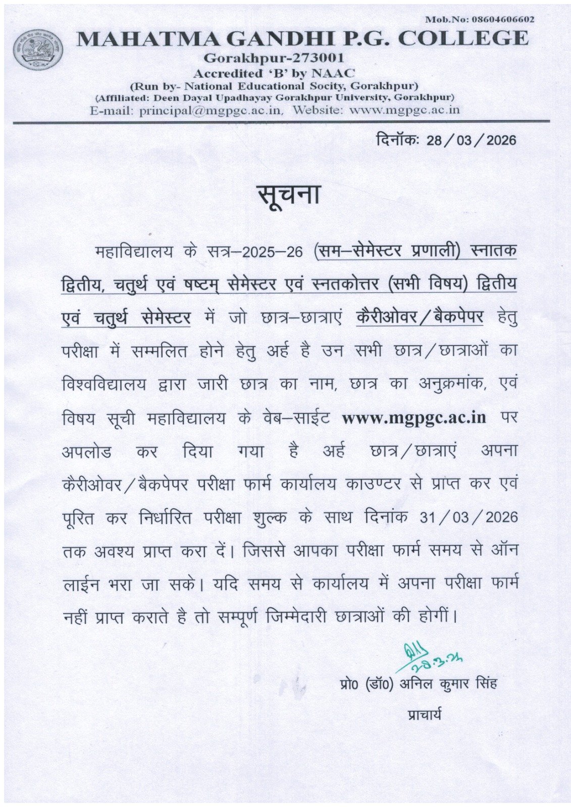 महाविद्यालय 26 एवं 27 मार्च 2026 को रामनवमी के शुभ अवसर पर बंद रहेगा ।